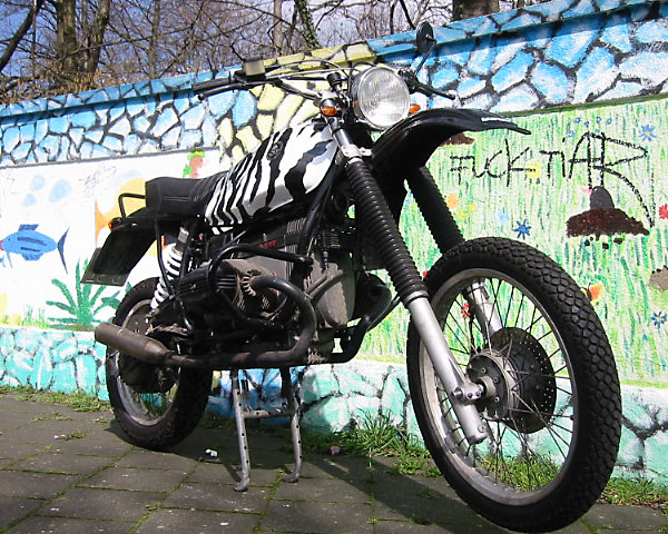 Safari-BMW – sprungbereit. Lange Marzocchigabel, lange Schwinge, lang Hubraum, kurze 2-in-2 und ganz kurzer Antrieb. Also Kupplung von der Rennstrecke. Was sonst ?
